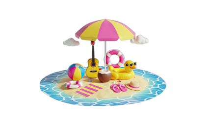 Summer Beach Scene with Umbrella, Guitar, and Duck Float