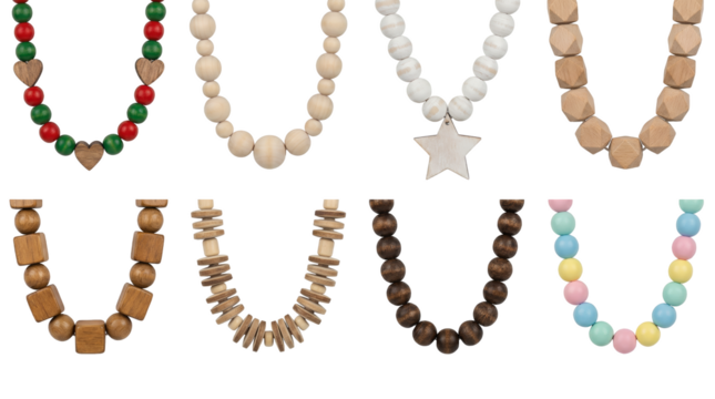Wooden bead garland set including various geometric shapes, stars, hearts, and colorful finishes. Decorative rustic jewelry and craft collection.