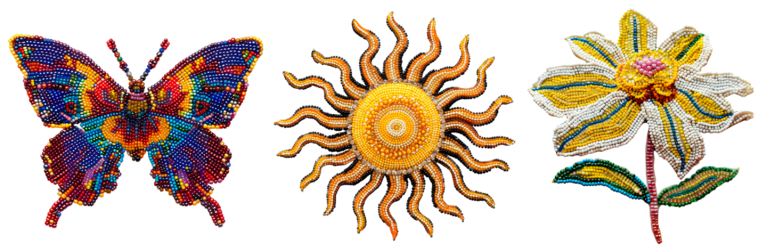 Handcrafted beaded designs featuring a vibrant butterfly, radiant sun, and a colorful flower on a transparent background. Perfect for artistic, decorative, and nature-inspired projects.