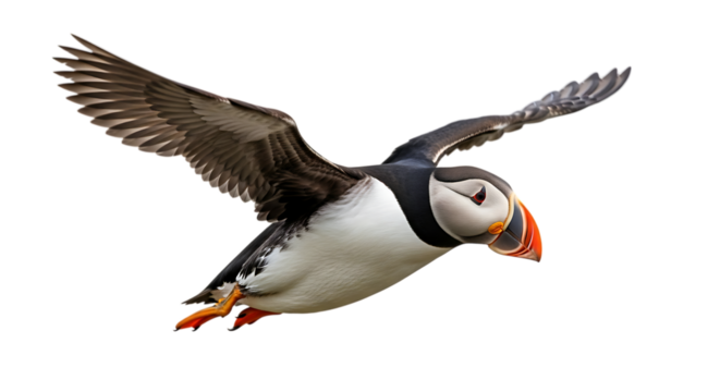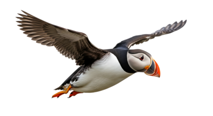 Atlantic Puffin, with distinctive orange beak in flight, cutout, PNG isolated on white or transparent background