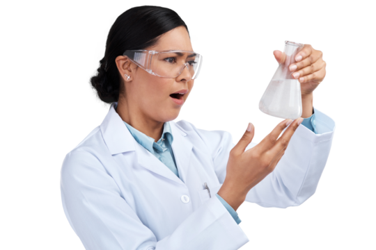 PNG of a cropped shot of an attractive young female scientist examining a beaker filled with liquid in studio against a grey background