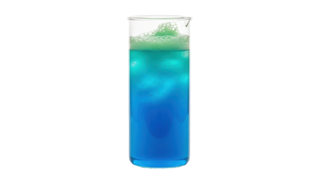 Isolated full lab beaker containing a blue liquid topped by a light green layer for a chemical lab