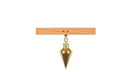 Brass plumb bob hanging from a wooden beam isolated on transparent background