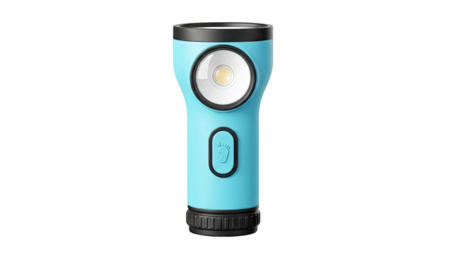 Detailed close up of a powerful silver metal led flashlight with textured grip isolated on transparent background