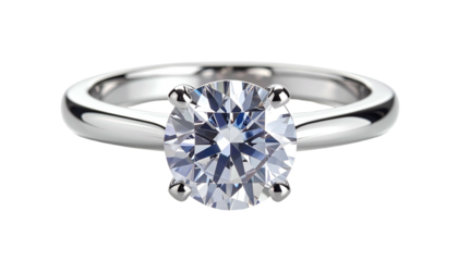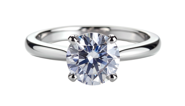 A close-up shot of a solitaire diamond ring with a white gold band. The gem sparkles, reflecting light