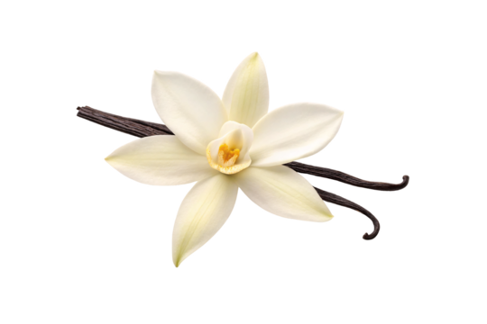 Vanilla orchid flower with cream colored petals and dark brown pods crossing behind the delicate bloom, isolated on a transparent background
