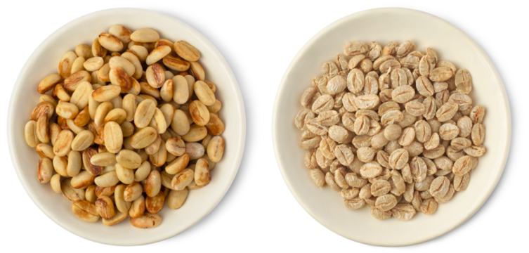 dried coffee beans with or without hull or parchment skin on white plates, coffea arabica, pulp and skin or flesh or the coffee cherry is removed, processing steps isolated on white background