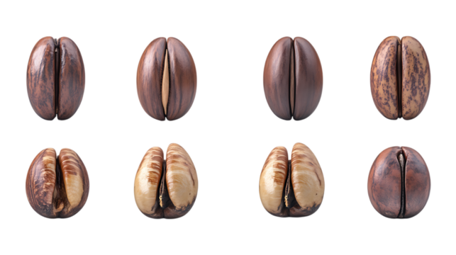 Various cacao beans show different stages of fermentation and drying isolated on a transparent background for food industry marketing.