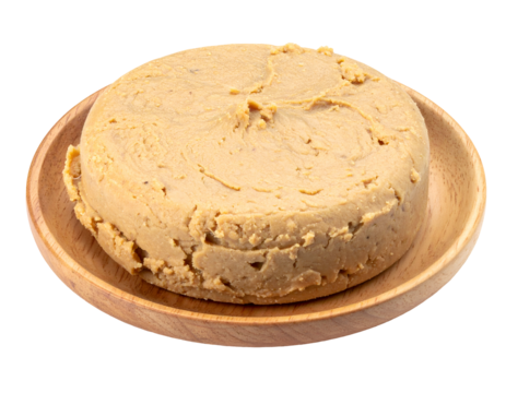 fermented soybean paste on wooden plate, traditional miso or asian bean product rich in umami, on isolated background