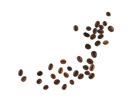 Pile roasted coffee beans isolated on a transparent background. Completely in focus.