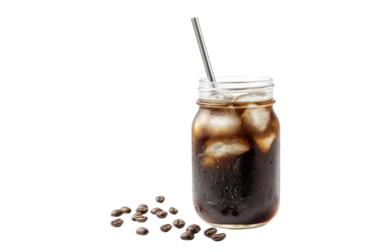 Iced Coffee Delight: A refreshing glass of iced coffee with a metal straw, sitting on a plain surface next to scattered coffee beans, offering a delightful blend of cool and invigorating.