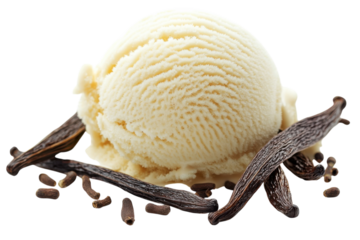 Creamy vanilla bean ice cream a cool summer treat paired with fragrant vanilla pods on a sleek black isolated on transparent background. Generative Ai.