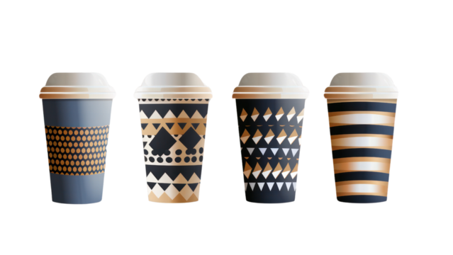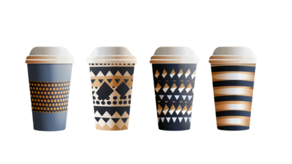 Four coffee cups with different designs and patterns