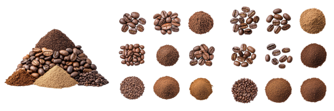 A collection of various coffee beans and ground coffee, arranged in different shapes and textures, highlighting their diversity.