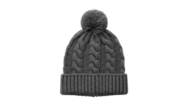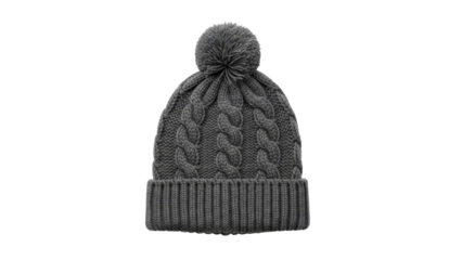 Gray cable knit winter beanie with fluffy pompom on transparent background, PNG image, PNG file