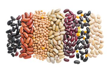 Different types of beans such as kidney beans, black beans, pinto beans, and chickpeas, isolated on white background.