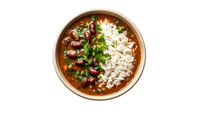 Bowl of red beans and white rice isolated on transparent background, a healthy and simple meal