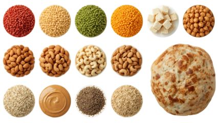 Assortment of grains and legumes in oval bowls isolated on transparent background