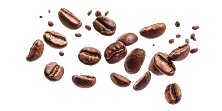 Roasted coffee beans exploding and flying on transparent background, perfect for advertising and packaging