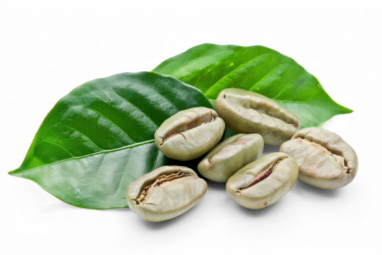 Unroasted raw green coffee beans with leaves, closeup detail isolated on transparent background. Generative AI