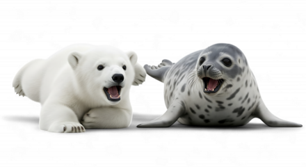 Hairless dog and a fluffy polar bear cub sit together on a rock, against a transparent background. background removed