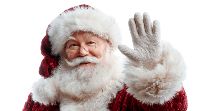 man dressed as Santa Claus waving isolated on white background