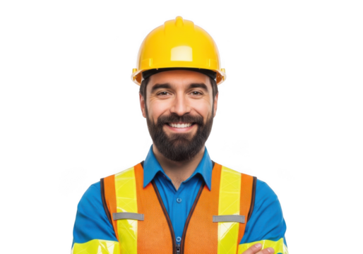 Smiling bearded male construction worker wearing yellow hard hat and high visibility safety vest isolated on transparent background