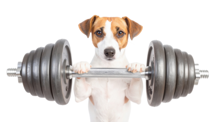 A dog holding a heavy dumbbell, showcasing strength and determination in an amusing and engaging manner.