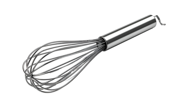 Metallic whisk angled, bright silver handle, twisted wire structure