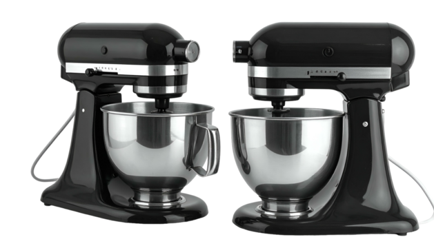 Two electric stand mixers, black with stainless steel bowls, are shown side-by-side