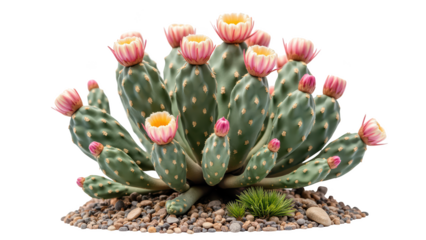 Vibrant cactus with pink blossom in geometric pot on transparent background