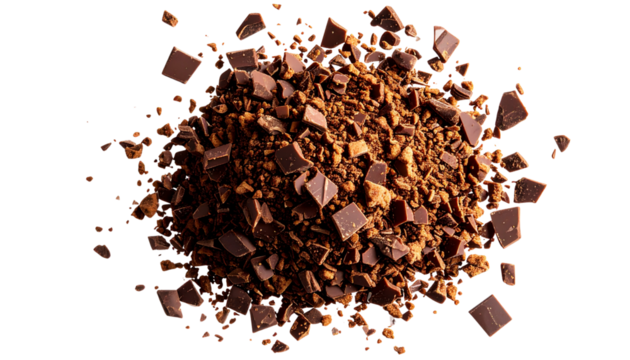 A close up of chocolate pieces scattered in the air. The scen is chaotic and messy, with the chocolate pieces flying in all directions. The idea behind the image is to capture the essence of chocolate