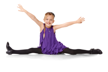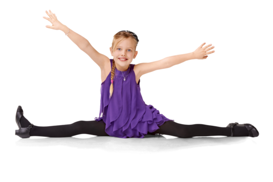 Dance, split and wow with portrait of child on png background for flexibility, stretching and ballet. Happy, contemporary and creative with girl isolated on transparent for smile, energy and fitness