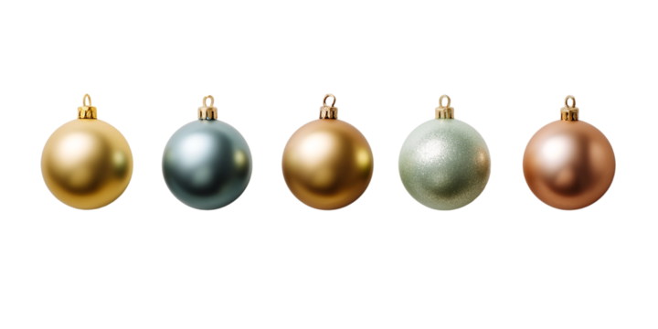 Group of five decorative Christmas ornaments in various colors displayed against a white background. PNG file
