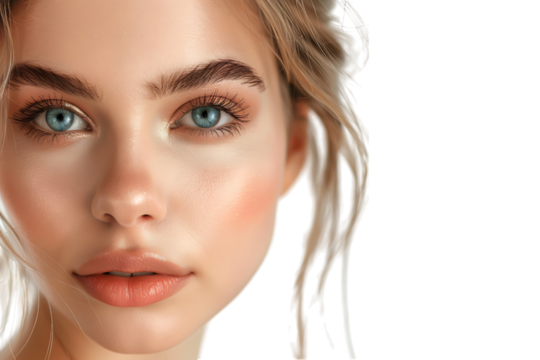Beautiful young woman with closed eyes and perfect skin isolated on transparent background