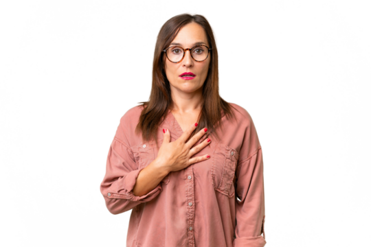 Middle-aged caucasian woman over isolated background surprised and shocked while looking right