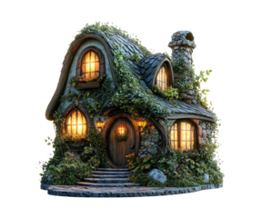 Charming Fairy Tale Cottage Surrounded by Lush Greenery and Warm Light
