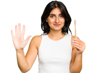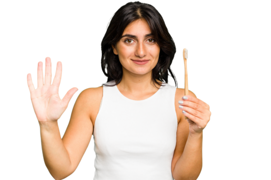 Young Indian woman holding a toothbrush isolated smiling cheerful showing number five with fingers.