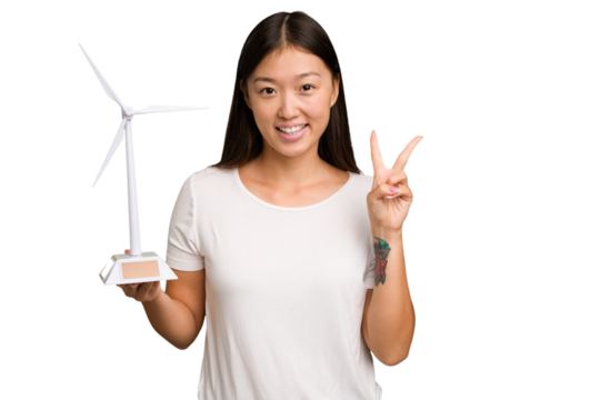 Radiant young woman with stunning curls showing number two with fingers.