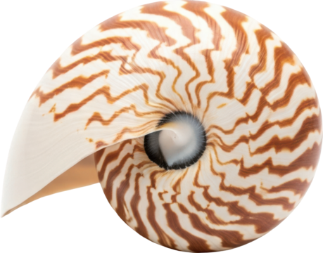 A detailed crosssection of a nautilus shell, showcasing its intricate spiral chambers and natural patterns, isolated on a transparent background