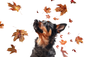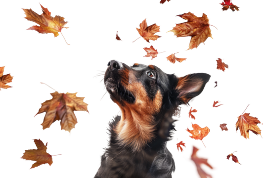 A Dog Gazing up at Autumns Dance. White or PNG Transparent Background.