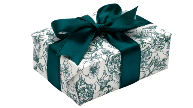 A beautifully wrapped gift box adorned with a delicate floral pattern and tied with a luxurious dark green ribbon and bow, isolated on a clean transparent background