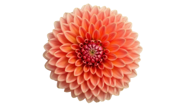 Isolated orange dahlia flower, petals arranged in a circular shape, intricate center detail