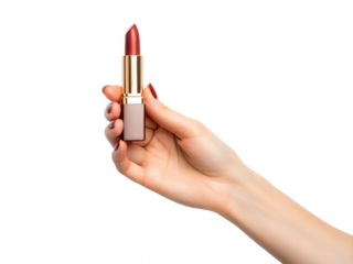 A hand holding a stylish lipstick against a black background, highlighting beauty and cosmetic elegance.