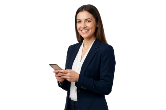 Portrait of a beautiful businesswoman holding a phone, isolated on transparent background