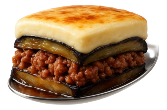 Greek mediterranean dish Moussaka with baked eggplants, ground beef isolated on transparent png