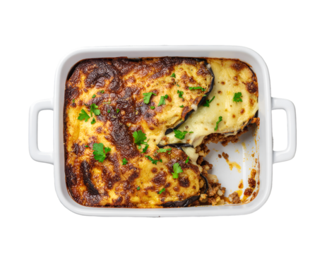 A close up shot of a moussaka dish with layers of eggplant meat sauce and a creamy topping baked golden brown on transparent background