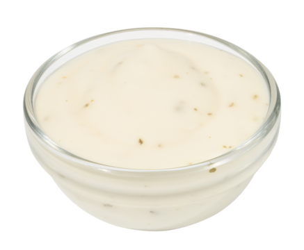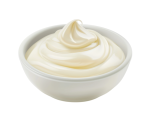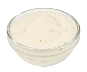 A dollop of creamy mayonnaise or white sauce on a silver spoon, isolated on a clean white background with a soft shadow
