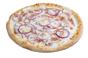 Carbonara pizza with ham and raw egg with white cream sauce.