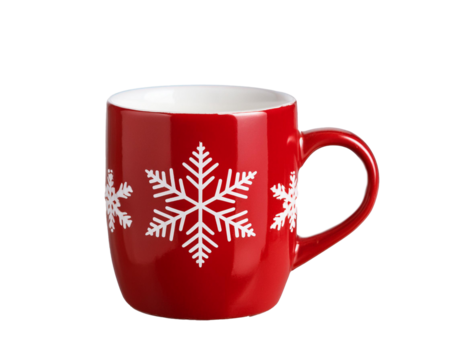rote Tasse mit Weihnachtsmotiv, Schneeflocken isoliert, Freisteller, Transparent